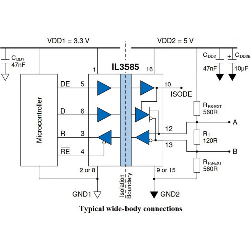 The IL3585 delivers an exceptional 2.3 V differential output into a 54 Ω load over the supply range of 4.5 V to 5.5 V. This provides better data integrity over longer cable lengths, even at data rates as high as 40 Mbps. The device is also compatible with 3 V supplies, allowing interface to standard microcontrollers without additional level shifting.